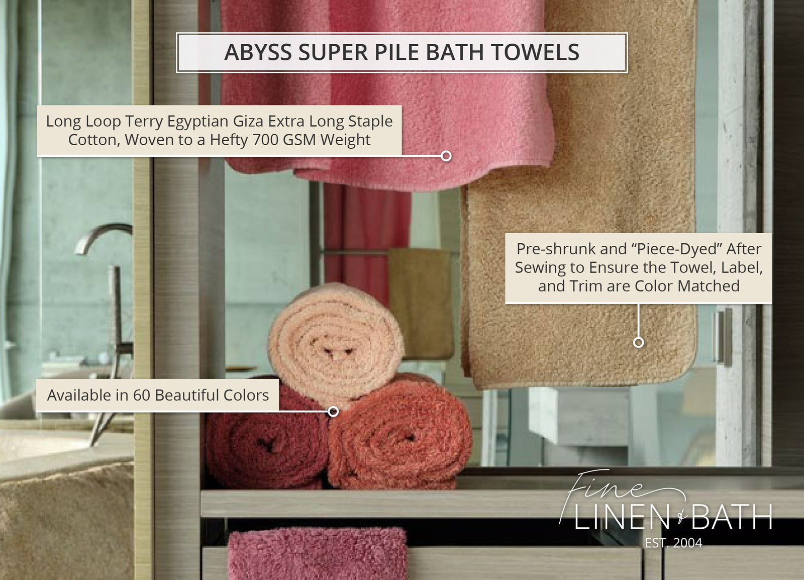 Every Abyss towel is crafted with the finest attention to detail. The Giza 70 cotton used in these towels provides incredible softness while ensuring durability and minimal lint. Abyss towels are finished with continuous, rounded corners and cotton canvas trim, making them more durable than traditional towels. Pre-shrunk and piece-dyed after sewing, each towel is guaranteed to maintain its color and condition wash after wash.