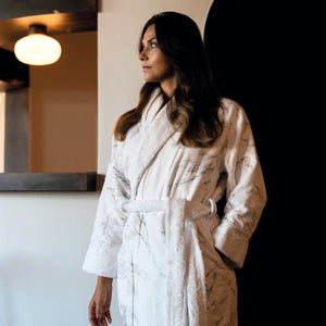 Graccioza's Mabel bath linens bring the look of marble with the feel of pure comfort. Robes are 600GSM.