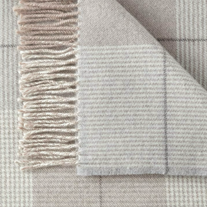 The fringed Peacock Alley York Merino Wool Plaid Throw blanket is made of 100% super-fine Merino wool. Sourced from a 180-year-old family mill in Italy, and made in Lithuania. Merino fiber absorbs and retains up to 30% of its own weight in moisture and still feels dry to the touch.