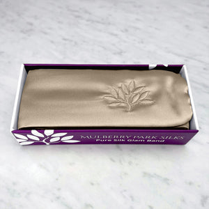 Pure Silk Glam Band: A Beauty Essential. If you've spent any time with Mulberry Park Silks products, you know that they’re all about how silk benefits your hair and skin. Now, let them streamline the rest of your skin-care and makeup routine with their handy, stylish accessory: pure silk beauty bands. The Mulberry Park Silks Glam bands are perfect for holding hair back during workouts, skin care treatments, and daily makeup application and removal. While a traditional makeup headband can tug and damage delicate regrowth at the hairline, their pure silk beauty headband is gentle, preventing breakage and damage. Silk also helps your hair and skin retain moisture and keeps your pricey hair and skin products where they belong! This luxurious spa headband with Velcro closure feels secure, yet smooth enough to slip in and out of hair without tugging. Mulberry Park Silks’ 100% pure Grade 6A silk headband is handmade and makes a great gift. This product is made of the highest quality, Grade 6A Mulberry silk. As a silk-loving company located in Branford, CT, we know the power you feel when you have a great hair day!