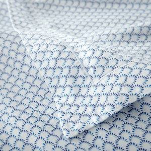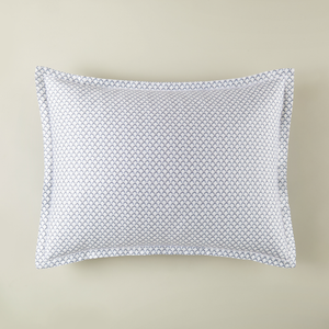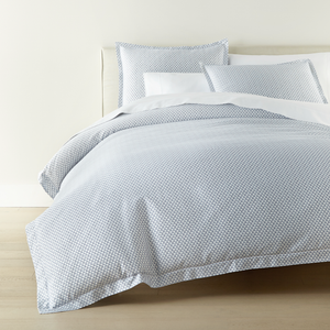 The Demi design features a refined, small-scale scalloped geometric pattern in navy on a crisp white background—perfectly balancing classic style with modern flair. The design is both understated and eye-catching, making it a versatile choice for mixing and layering with other Peacock Alley collections. Expertly crafted in Portugal from 100% cotton sateen for a silky-soft hand and elegant drape, Peacock Alley's duvet sets complement a variety of bedding looks.