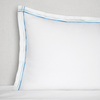 A double border of blue satin-stitch makes a stylish statement in the young adult Tratto bedding style from Sferra. Paired with the charming Plaidino, a collection of French blue plaid rendered in watercolor brushstrokes, this bedding transforms the bedroom into a serene blue sanctuary.