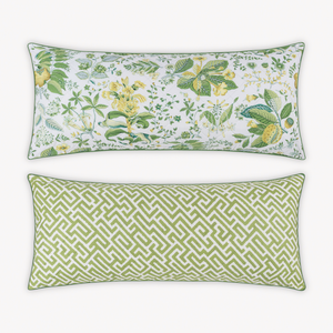 Matouk's reversible lumbar pillows feature two complementary prints, piped edges and a hidden zipper designed for seamlessly showcasing each side. They’re a playful, eye-catching way to customize your look.