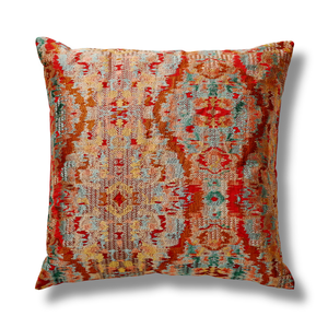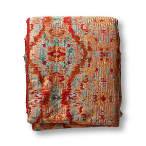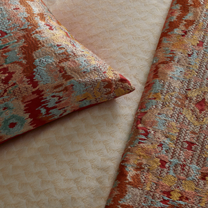 Inspired by a cup from Ancient Egypt given to the Pharaoh as part of a dowry, hence its name in the line, The Met x Ann Gish Dowry Throw and Decorative Pillow. With this cup, two things immediately stood out — the color palette and the ogee shape of the cup itself. To highlight those two elements of the design, a freehand ogee layout was created, then filled in with that gorgeous terra cotta background, along with contrasting and complementary tones. The result is a stunning embroidered design, rich in both history and colors.