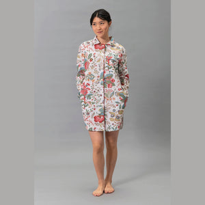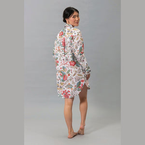 • Captivating Pomegranate Print: Adorned with a vibrant and intricate pomegranate and botanical print, the shirt is available in two stunning colorways: