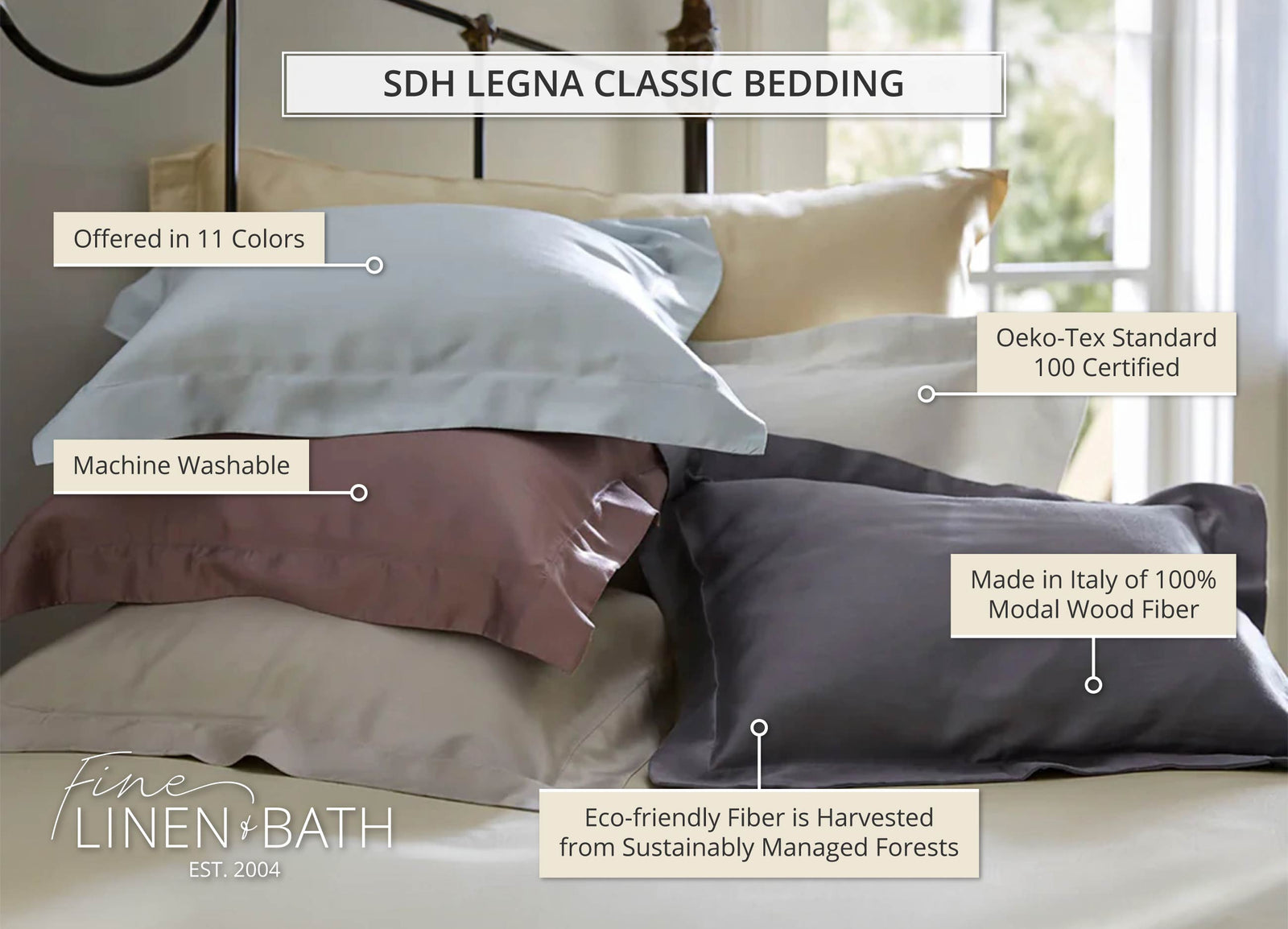 SDH Legna Classic Collection is an eco-friendly line of modal bedding that combines the smooth, supple feel of silk with the easy care of cotton. Luxuriously soft, Legna bedding offers true and lasting beauty. It drapes beautifully, washes easily, and grows softer over time. The modal fiber used to make Legna Classic bedding is harvested from the wood pulp of beech trees, which are grown in sustainably managed European forests under strict environmental guidelines. SDH Legna Classic bedding is also OEKO-TEX® STANDARD 100 certified as safe from harmful chemicals.