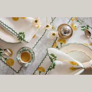 Matouk's Gisele Table Linens is artful, refined and whimsical all at once. This original Schumacher print comes to life with scarlet-hued blooming bouquets. Inspired by traditional block prints, Gisele is made on crisp linen and finished with an eye-catching embroidered wave.