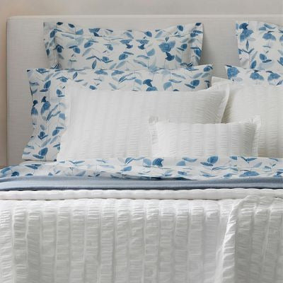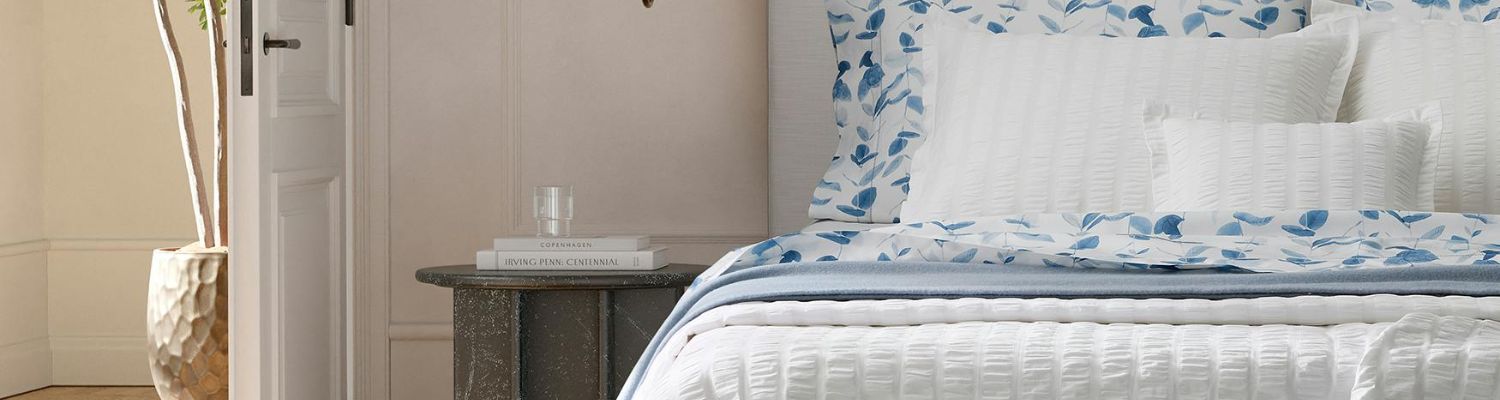 Coverlets and matelassés are a sophisticated option and made to lay between your flat sheet and duvet cover, or be used alone. Choose one with a matte finish for a casual look; a sateen finish for a sleeker vibe; or a matelassé with intricate designs and raised patterns for “quilted” look without the weight.