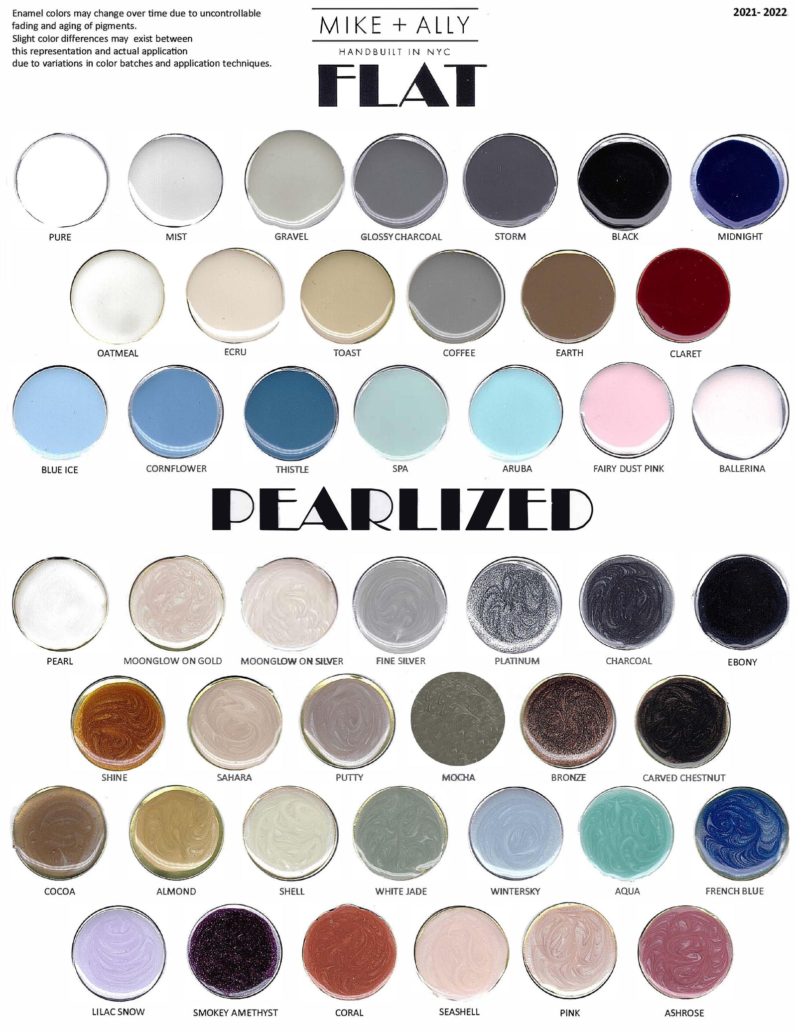 Any enamel-based collection can be made in any of Mike and Ally's standard colorways (see full color chart below). If none of these colors are the perfect fit for your style, we welcome you to use our color-match service to make customize pieces to perfectly fit your space.