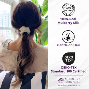 Our scrunchies are made from 100% pure Mulberry Charmeuse Silk and NEVER from synthetic or polyester satin. Available in a Small (skinny) size that is best for thin hair and short hair and a Large size that is great for thicker hair.