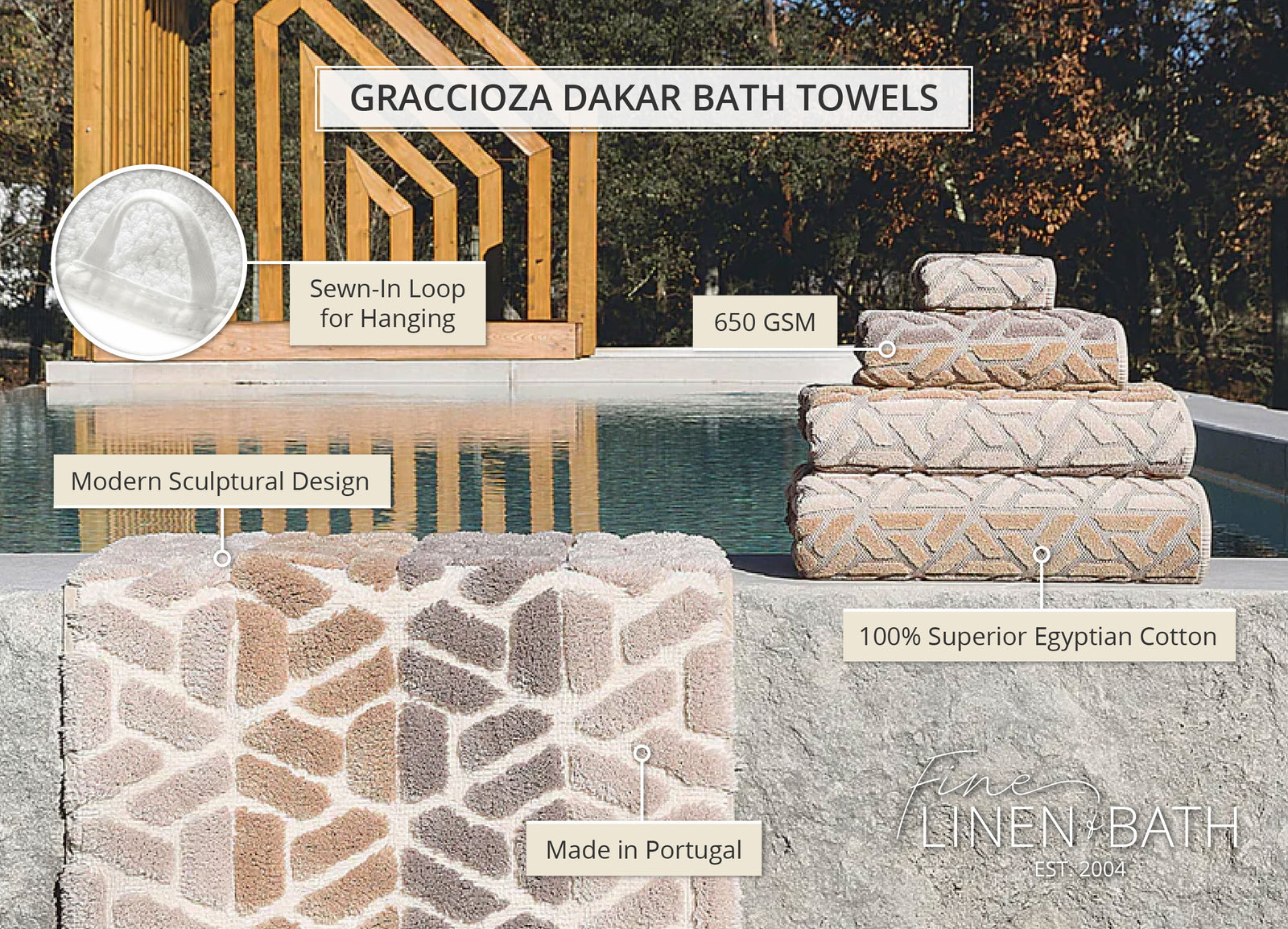 Graccioza's Dakar collection features a modern geometric design and a rich texture. These lovely towels and bath rugs are woven in a sculptured pattern of soothing neutral tones: brown, taupe, and beige. Dakar towels and rugs are made in Portugal from the finest combed cotton. The towels are a pleasing 650 GSM weight and are finished with rounded corners and double-sewn binding for durability. A convenient sewn-in hook makes for easy hanging. Dakar towels and rugs are pre-washed and pre-shrunk for absorbency. Available in a range of sizes.