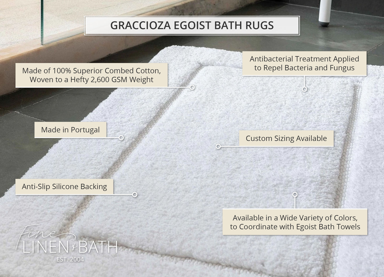 Graccioza's Egoist Bath Rugs are truly for those looking for the utmost in luxury. Using both woven and tufting in construction, this unique bath rug is the finest in both quality and comfort. The woven base matched the texture of the long tufted pile on the surface creating a level of softness, durability, and support that is unmatched. Made in Portugal from 100% Giza Cotton, these rugs are pre-washed and pre-shrunk for incredible absorbency. They’ve also been treated to resist bacteria and mold. All rugs come with an anti-slip silicone backing for added safety. Available in six sizes and 30 colors to perfectly match Graccioza Egoist Towels.