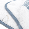The combination of white terry fabric with the blue embroidered accents gives it a refined, spa-like aesthetic.