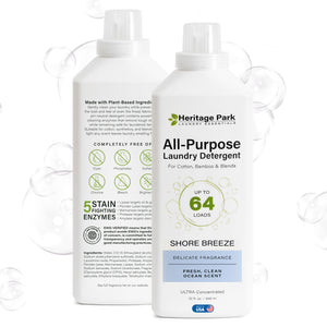 Heritage Park All-Purpose Laundry Detergent is perfect for everything from your finest heirloom linens to household laundry; use on cotton, linen, bamboo, synthetics, blends, and more. It can also be used to pre-treat stains and to hand wash. Heritage Park All-Purpose Detergent comes in Fragrance-Free (hypoallergenic), Lavender Mist, Spring Magnolia, and Shore Breeze Scents.