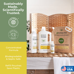 The unique formulation has the perfect balance of powerful, yet safe, ingredients to remove tough stains while remaining gentle on clothes, bedding, towels, synthetic fabrics, blended fabrics, and even heirloom linens and other dedicates. Unlike harsh commercial detergents, Heritage Park is made without sulfates, dyes, phosphates, chlorine, bleach, or caustic chemicals. It has a neutral pH; is suitable for regular and HE washing machines; is Leaping Bunny certified as cruelty free; and is biodegradable and safe for septic and grey-water systems. Heritage Park Detergent comes in reusable bottles that can be filled with a refill pack to save plastic.