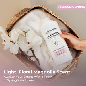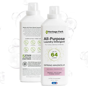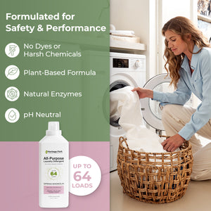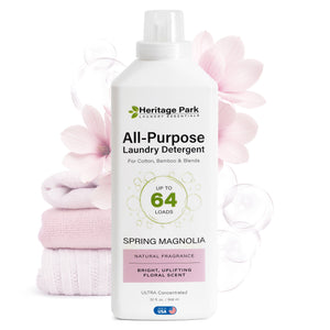 Heritage Park All-Purpose Laundry Detergent is perfect for everything from your finest heirloom linens to household laundry; use on cotton, linen, bamboo, synthetics, blends, and more. It can also be used to pre-treat stains and to hand wash. Heritage Park All-Purpose Detergent comes in Fragrance-Free (hypoallergenic), Lavender Mist, Spring Magnolia, and Shore Breeze Scents.