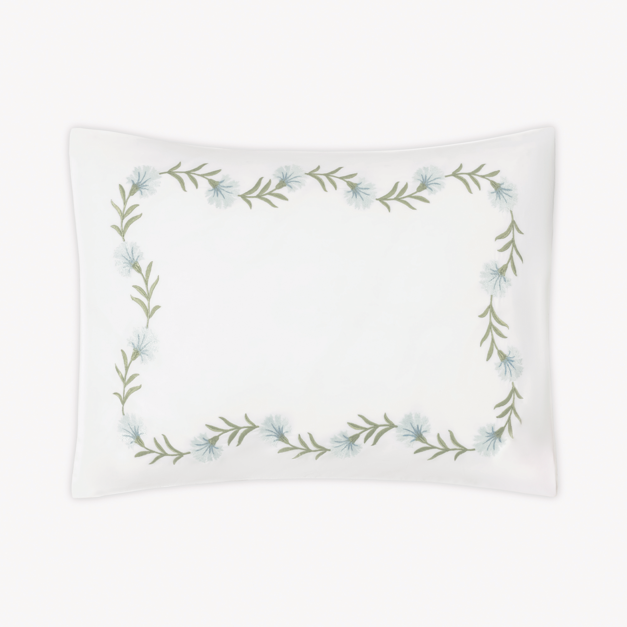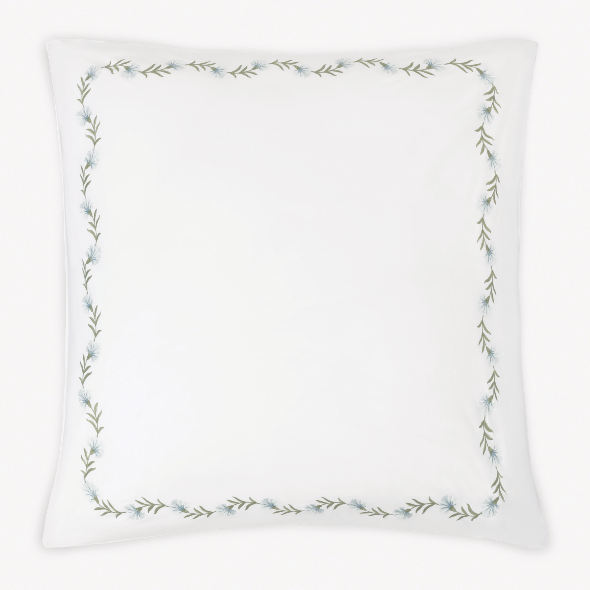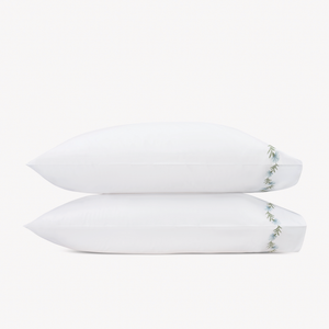 Matouk Daphne bedding features an embroidered floral vine that–depending on your choice of thread color–can be quietly classic or vibrant and bold.  Made on 520 thread-count white Ceylon percale, each piece is finished with a knife edge and delicate white cording.
