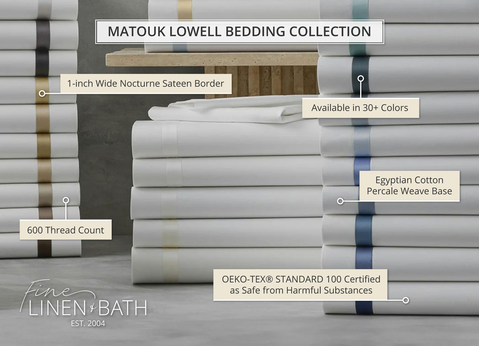 • Material: Matouk Lowell is a 600 thread count Egyptian cotton percale with a 1-inch wide Nocturne sateen border.