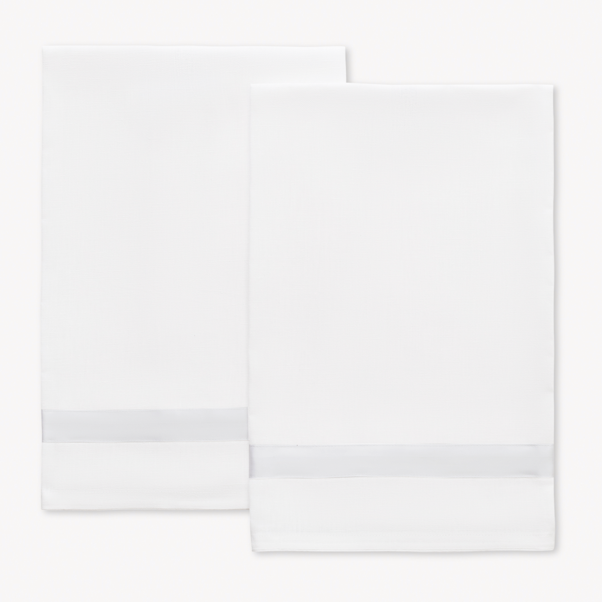 Matouk Lowell Guest Towels feature the beloved Lowell design reimagined as a linen guest towel, where white Valentina linen with Nocturne sateen trim offers a tailored, polished touch.