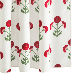 Artful, refined, and whimsical, the Gisele shower curtain features an original Schumacher print brought to life with vibrant blooming bouquets. Inspired by traditional block prints, this design is crafted on crisp linen and finished with elegant scallop embroidery, adding a charming and eye-catching touch to any bathroom.