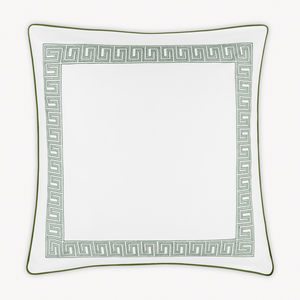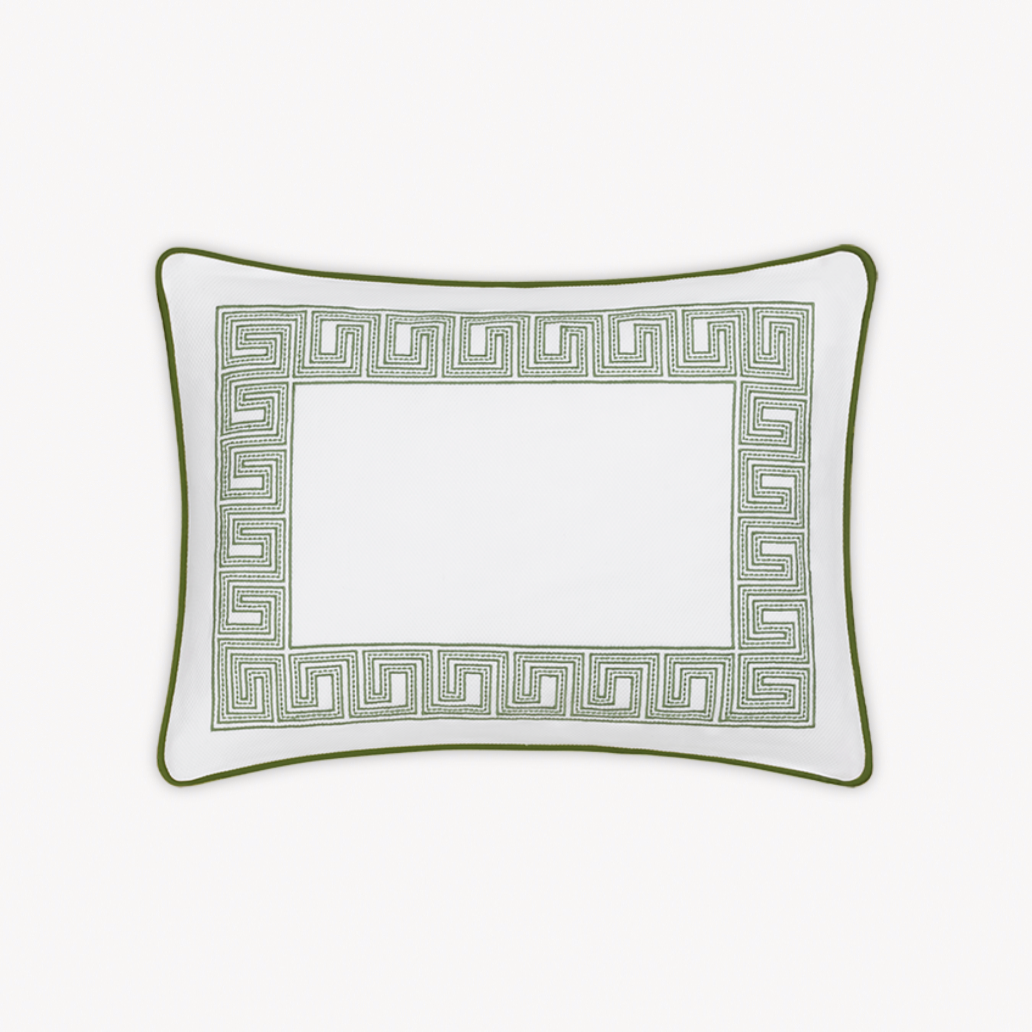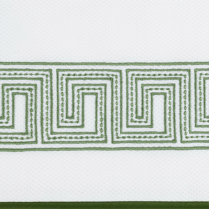 The Matouk Schumacher Ophelia Pique Coverlets and Shams draw inspiration from an intricately beaded Schumacher tape, featuring a boldly embroidered traditional Greek key pattern with a refined, bespoke sensibility. Crafted from Matouk's signature lightweight, small-weave pique fabric, these coverlets showcase a coordinating corded edge in luxurious Nocturne sateen, offering a sophisticated yet playful reinterpretation of a classic motif.