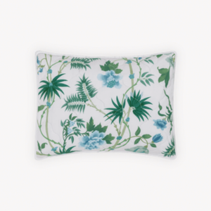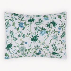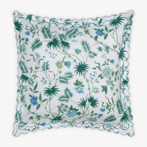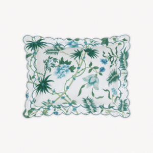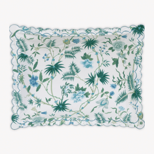 Based on a vibrant Schumacher wallpaper, Matouk Schumacher Palmyra Bedding in Emerald is a tropical print rendered in a lush emerald and blue-green palette with oversized palm fronds and blooms. Printed on Luca Egyptian cotton percale and finished with a double scallop embroidery, Palmyra offers an island-inspired escape that feels both tranquil and transportive.