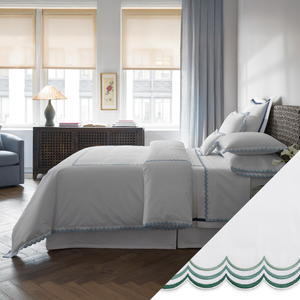 Matouk Stella is a stylish embroidered collection featuring three lines in tonal hues curved across the flange of crisp Milano percale sheeting. It has an Art-Deco feel that’s artistically inspired, and its range of color combinations is designed to delight the senses.