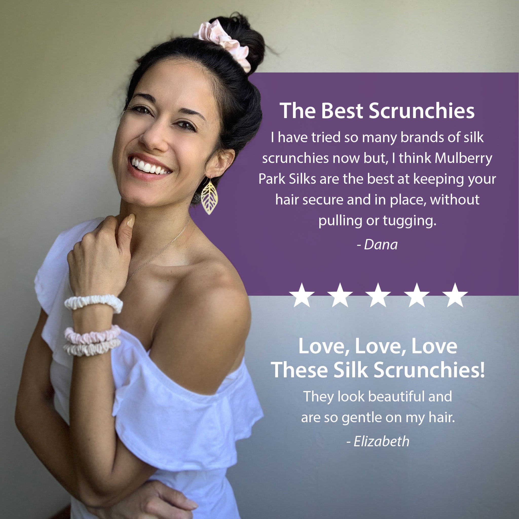 Our scrunchies are made from 100% pure Mulberry Charmeuse Silk and NEVER from synthetic or polyester satin. Available in a Small (skinny) size that is best for thin hair and short hair and a Large size that is great for thicker hair.