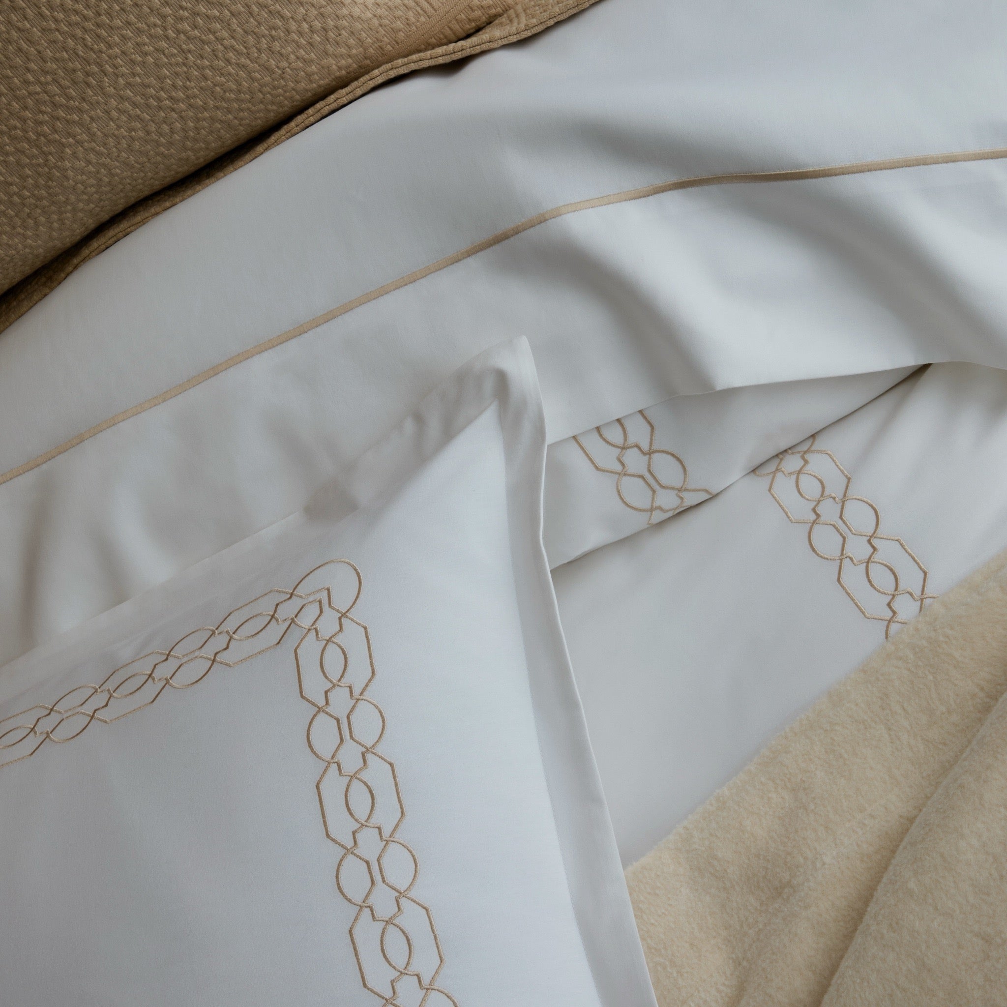 Taking its cue from classic hotel beds, the Peacock Alley Embroidered collection exudes timeless appeal. Embellished with a geometric embroidered border in the Filigree motif, it introduces a refined tracery design that pairs beautifully with an array of patterns.