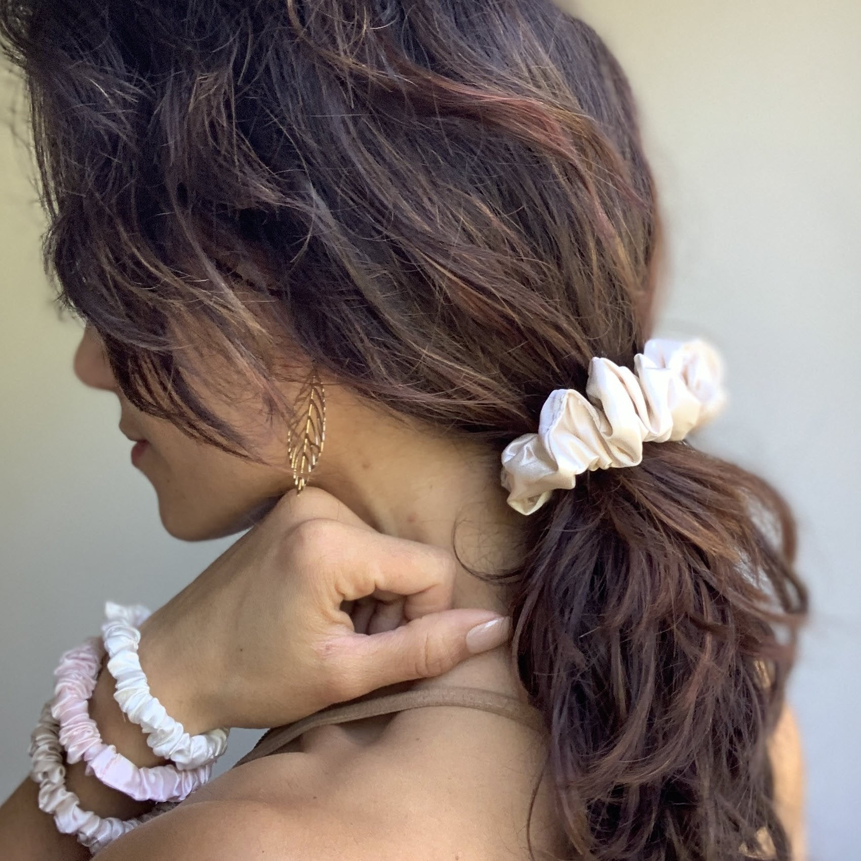 Our scrunchies are made from 100% pure Mulberry Charmeuse Silk and NEVER from synthetic or polyester satin. Available in a Small (skinny) size that is best for thin hair and short hair and a Large size that is great for thicker hair.