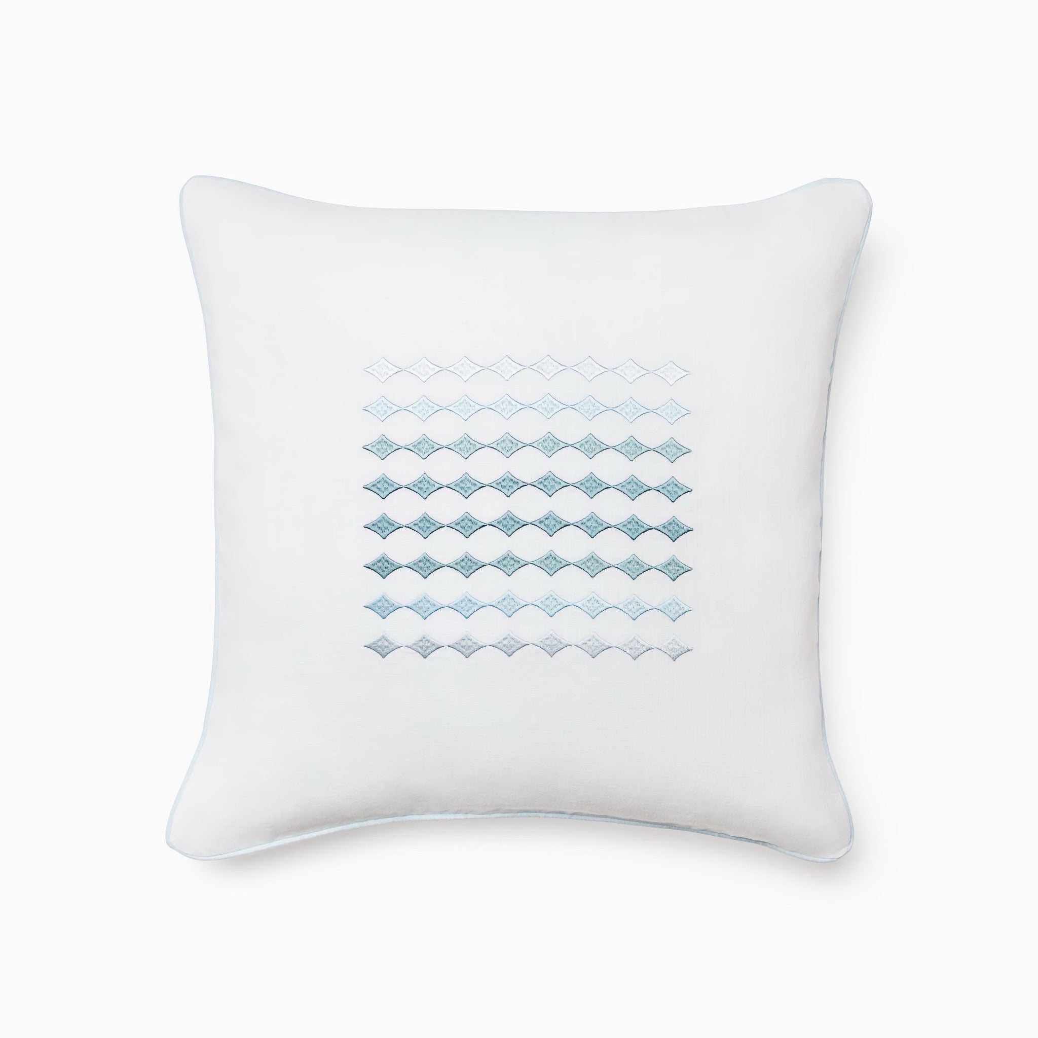 The SFERRA Ortona Decorative Pillow is a study in symmetry and craft. Embroidered in soft sky-blue tones on pure white linen, its diamond motif recalls the precision of mosaic tilework while retaining the gentle irregularity of a hand-drawn pattern. A subtle contrast edge frames the design with clarity, enhancing its refined simplicity. Crafted with meticulous attention to detail, Ortona brings a sense of balance and calm—an understated accent for bed, sofa, or armchair.