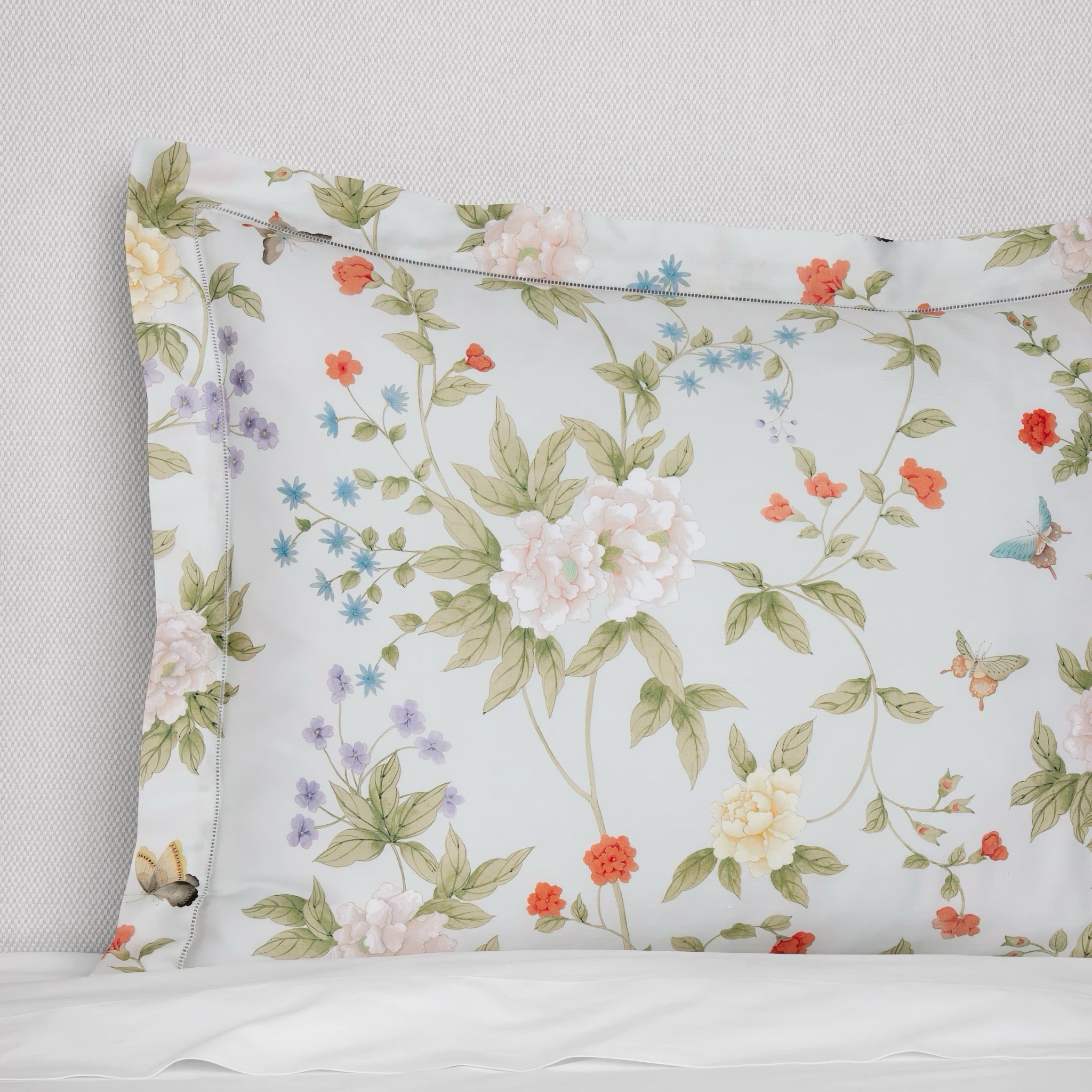 SFERRA and Scalamandré unite once more to present the Luoyang Garden Bedding Collection, an archival signature reimagined for the modern home. Inspired by the legendary peony gardens of Luoyang, China—celebrated for their beauty and symbolism—the design unfolds as a lush tableau of blooming peonies and delicately fluttering butterflies. First adapted from a hand-painted Chinese silk panel preserved in the Scalamandré archives, the motif has been transformed into a soft watercolor composition, capturing the serenity and romance of an ancient garden in full bloom. Printed in Italy on silky-smooth, long-staple cotton sateen, Luoyang Garden brings mural-like artistry to the bedroom, infusing the space with painterly elegance and timeless botanical charm.