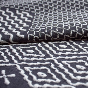 Inspired by a Meiji-era kimono, The Met x Ann Gish Sashiko Hishi-Moyo Duvet Cover and Decorative Pillow closely reinterpret an overstitched kimono in black and white. Hishi-moyo denotes a sashiko technique forming a diamond pattern.