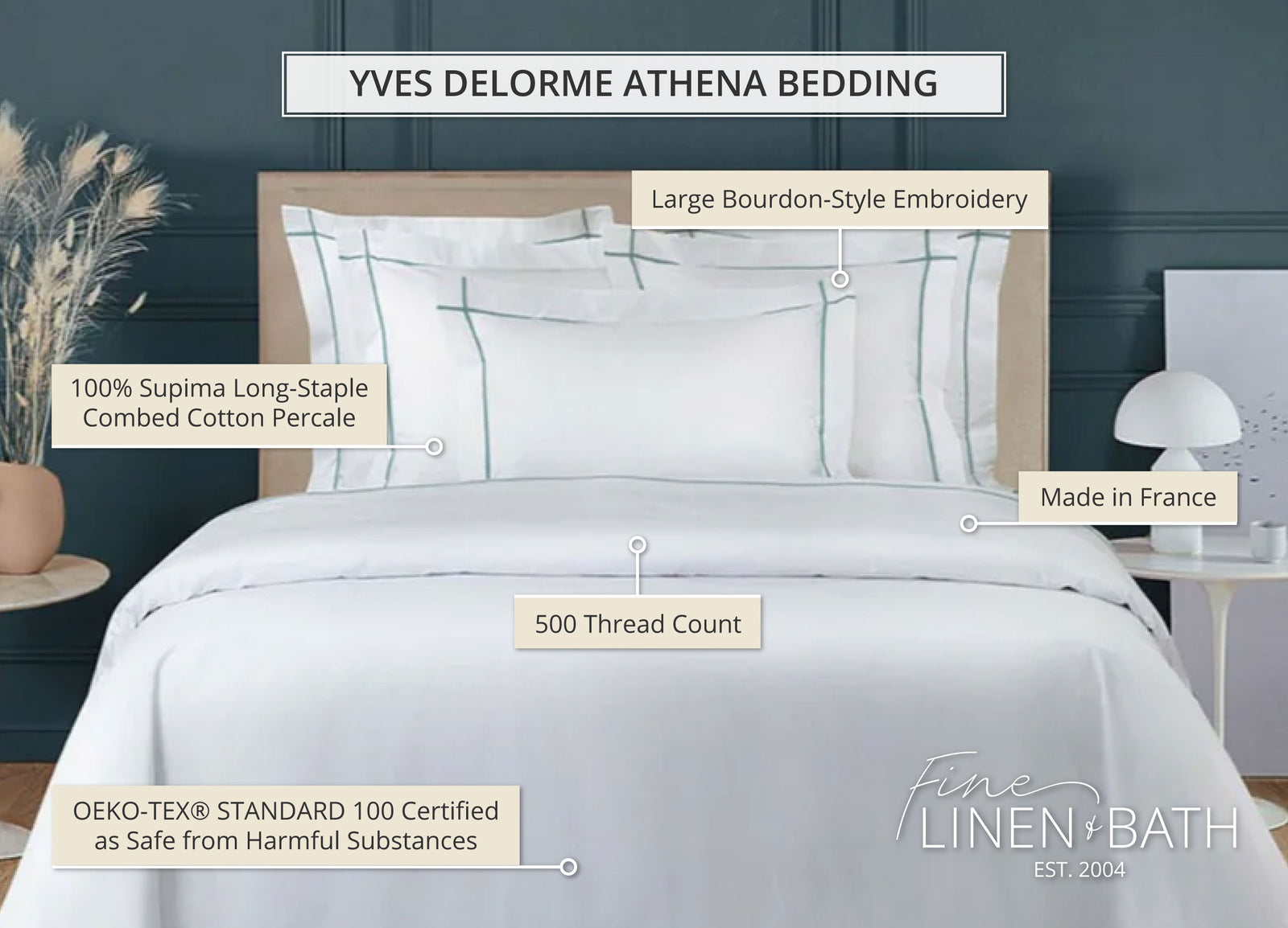 Wake up like a goddess in the freshness of organic cotton percale. Athena, goddess of handicraft and weaving, inspires the luxurious identity of this Yves Delorme timeless classic design. A crisp, resistant, sophisticated, and matte finish guarantees the excellent quality of this textile. The pure graphic expression of a colored bourdon stitch extends vertically and horizontally for a modern, edge-of-the horizon look.Made with care in France from 100% Supima long staple combed cotton percale, 500 thread count. Fabric is certified STANDARD 100 by OEKO-TEX®. White with bourdon stitch frames in your choice of 10 stunning colors.