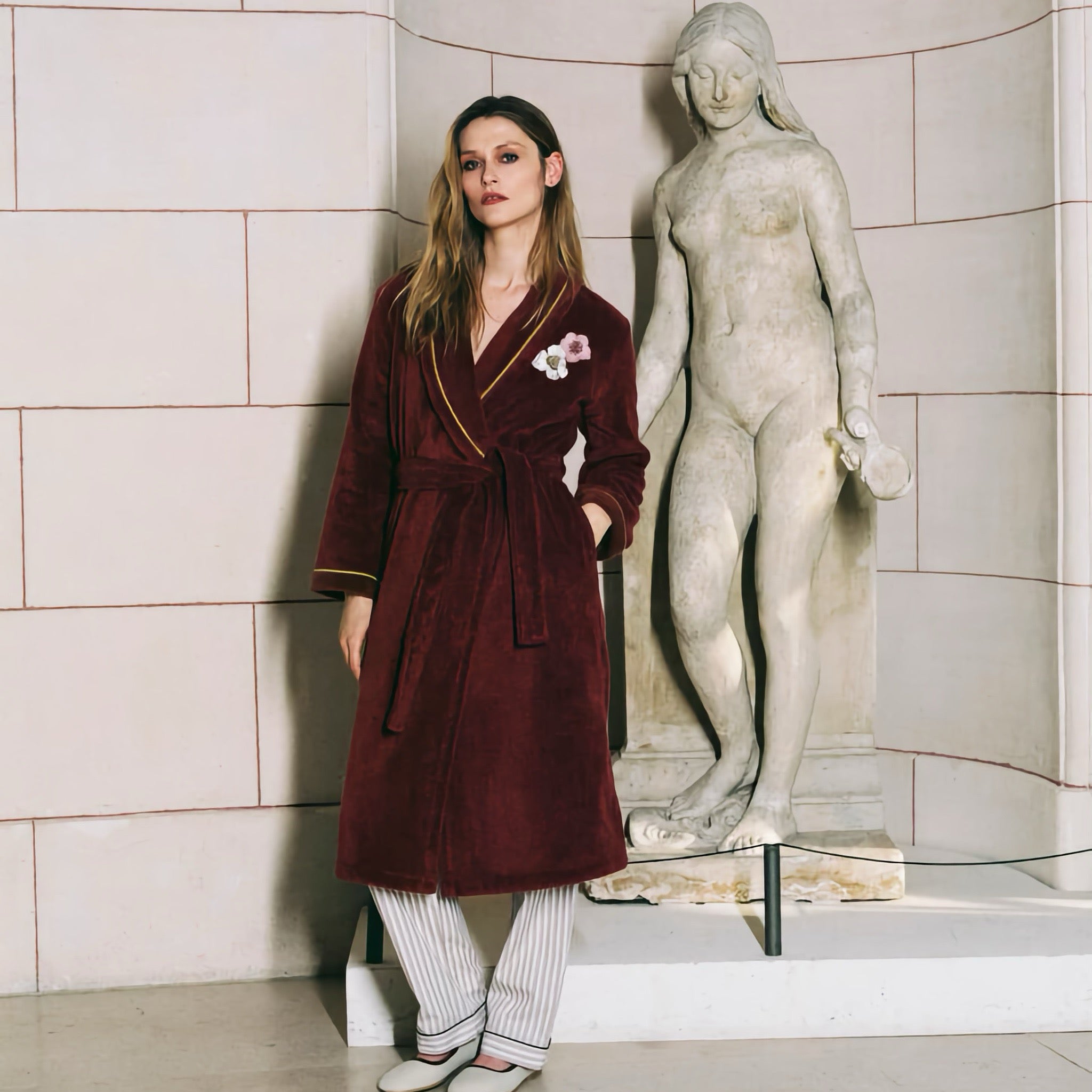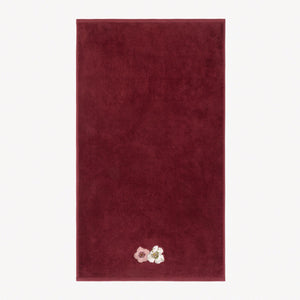 The Yves Delorme Corolles Bath Collection stands out with its soft, enveloping texture, enhanced by delicate embroidery that brings a touch of elegance to your bathroom. The dark maroon color and floral embroidery of this towel will bring a sense of delicate drama to your space.