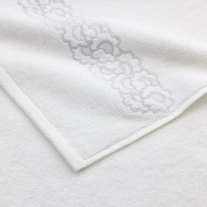 The Yves Delorme Festons Bath Collection reveals the beauty of a delicate embroidered motif, expressed with lightness on soft, plush terry cloth—for everyday elegance.