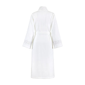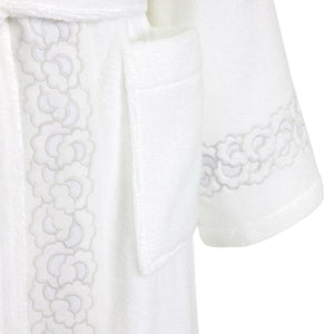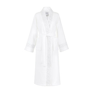 These elegant towels and bath robe pair well with the Yves Delorme Festons Bedding Collection for a complete look.