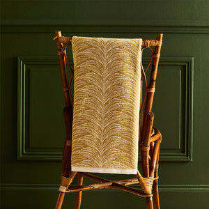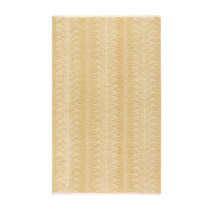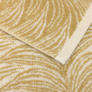 The Yves Delorme Pollen Bath Collection is a patterned towel style that shows hazel blossoms scatter their pollen in subtle plays of light across the terry cloth, creating a natural and graphic motif that brings a poetic touch to the bath space.